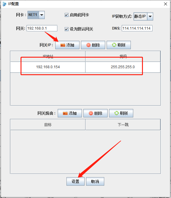 選擇要修改或添加IP的網卡,如NET1,修改原IP或添加新的IP,輸入完成后,最后點擊設置按鈕生效。